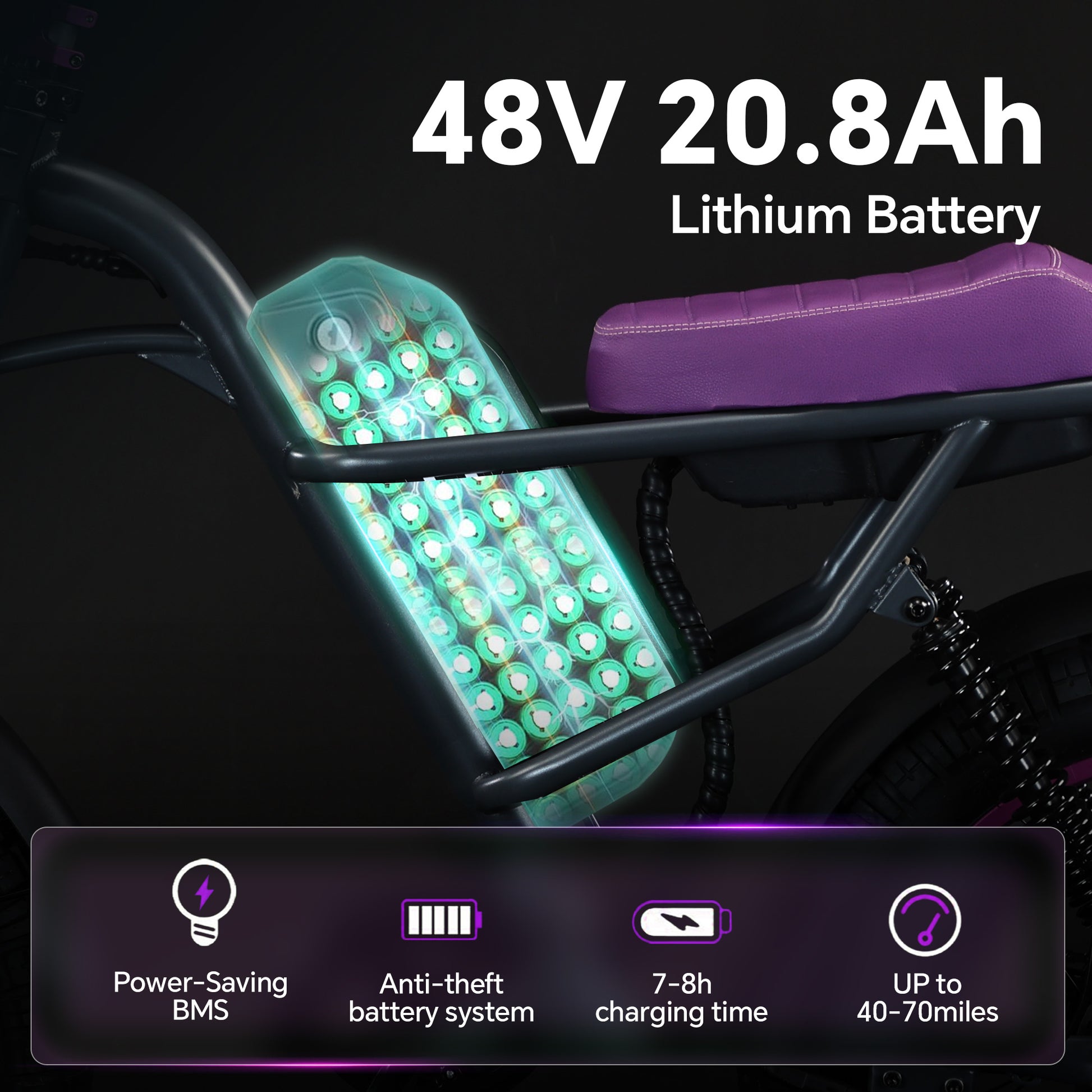 - Ultra-long battery life certification: Equipped with a 48V/22Ah high-capacity lithium-ion battery, UL 2849 safety certified, it takes only 6 to 7 hours to fully charge. In pedal assist mode, the range on a single charge reaches 25 to 28 MPH.